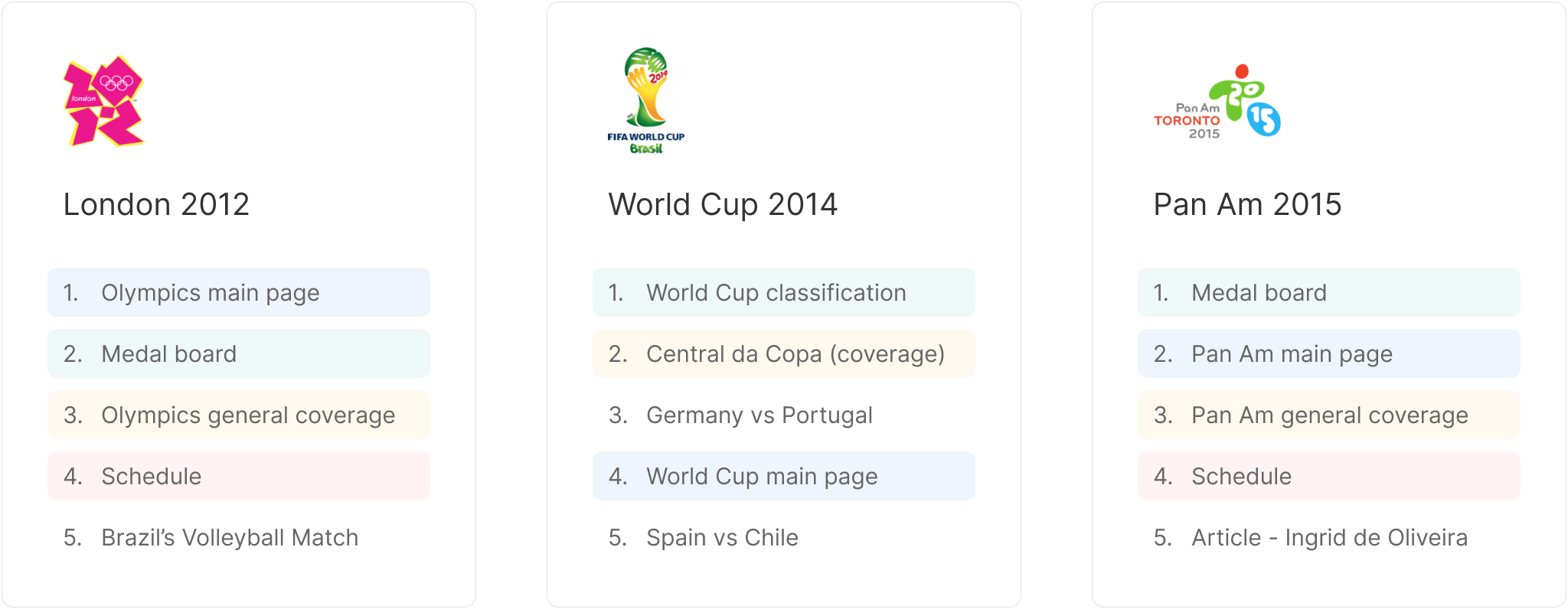 It is hard to find the user goals related to this kind of sports event because their consuming behavior is not regular, and technology and habits change a lot between one event and the next one. We started analyzing the most visited pages of the last big sports events we covered. Focusing on the top of the list, we perceived a pattern: four specific contents were always among the largest audiences.
