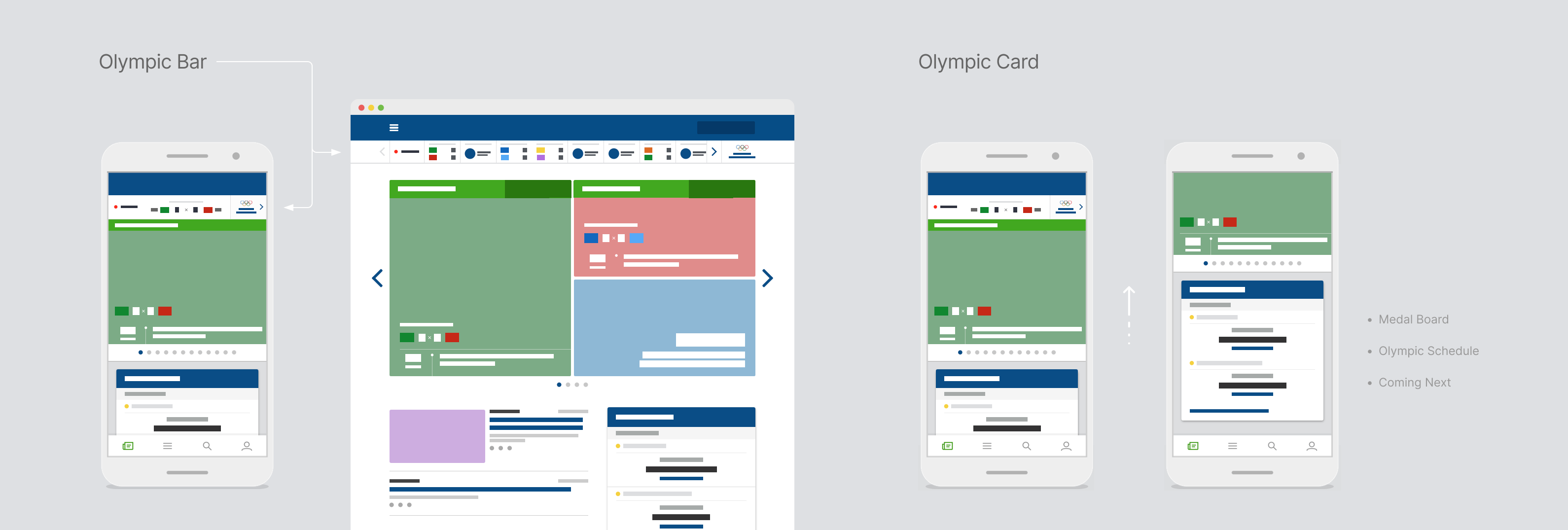 To bring consistency and reinforce navigation through those different contents, we proposed two components. The first one was the Olympic Bar. Based on a former component for breaking news, it had a privileged position, it could be implemented in the external pages, and it reinforced the Olympic branding. The other component was the Olympic Card. Like the bar, it used the same product card structure, and we planned it to display the Medal Board, the Olympic Schedule, and Coming Next highlights.