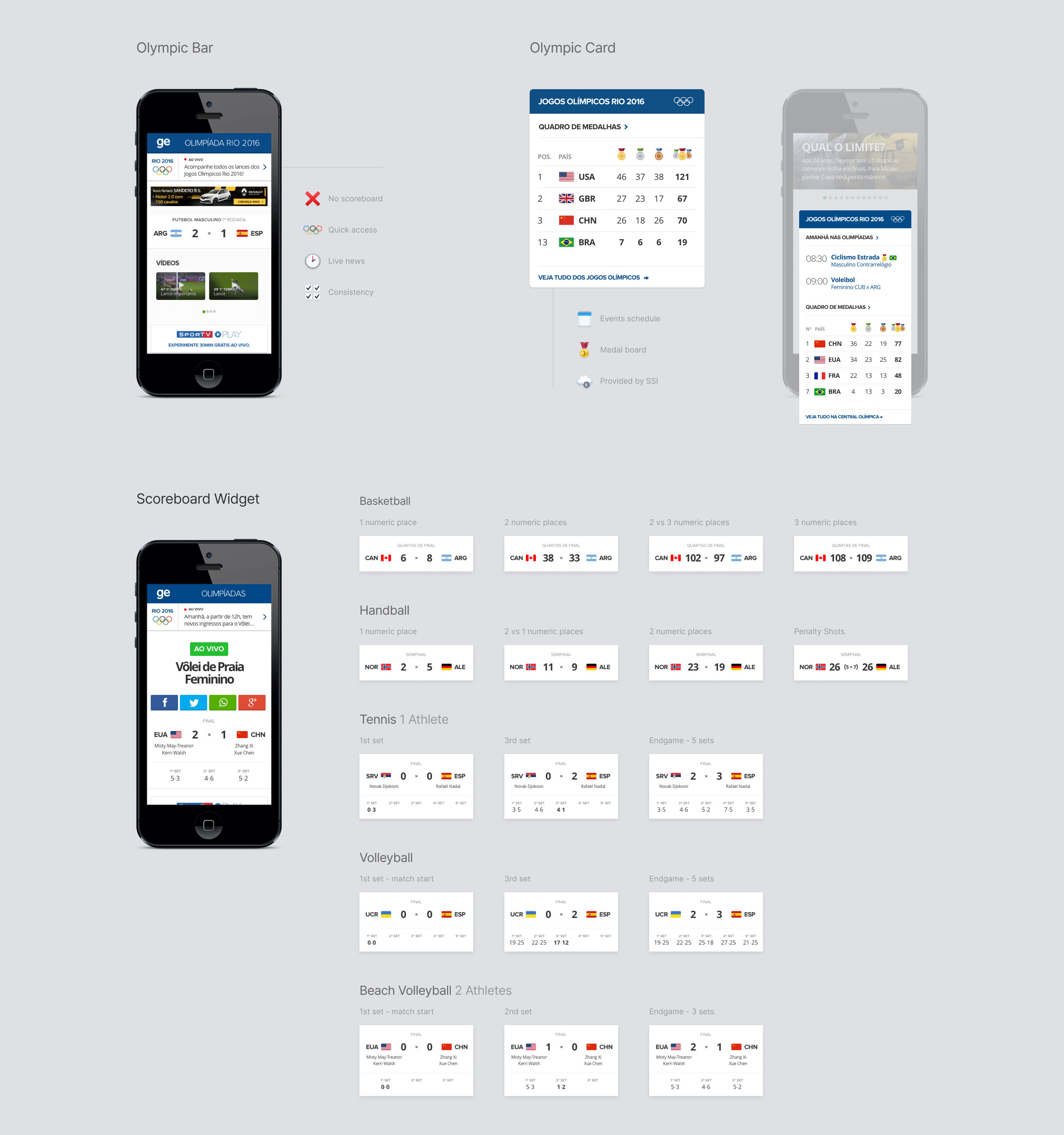 After that validation, I worked on the different coverage scenarios for the Olympic Card. Since the Games had a very clear schedule, we could implement all those versions and set them for automatic displaying. A nice detail: every event with a Brazilian athlete participating there was the Brazilian flag next to the event name.