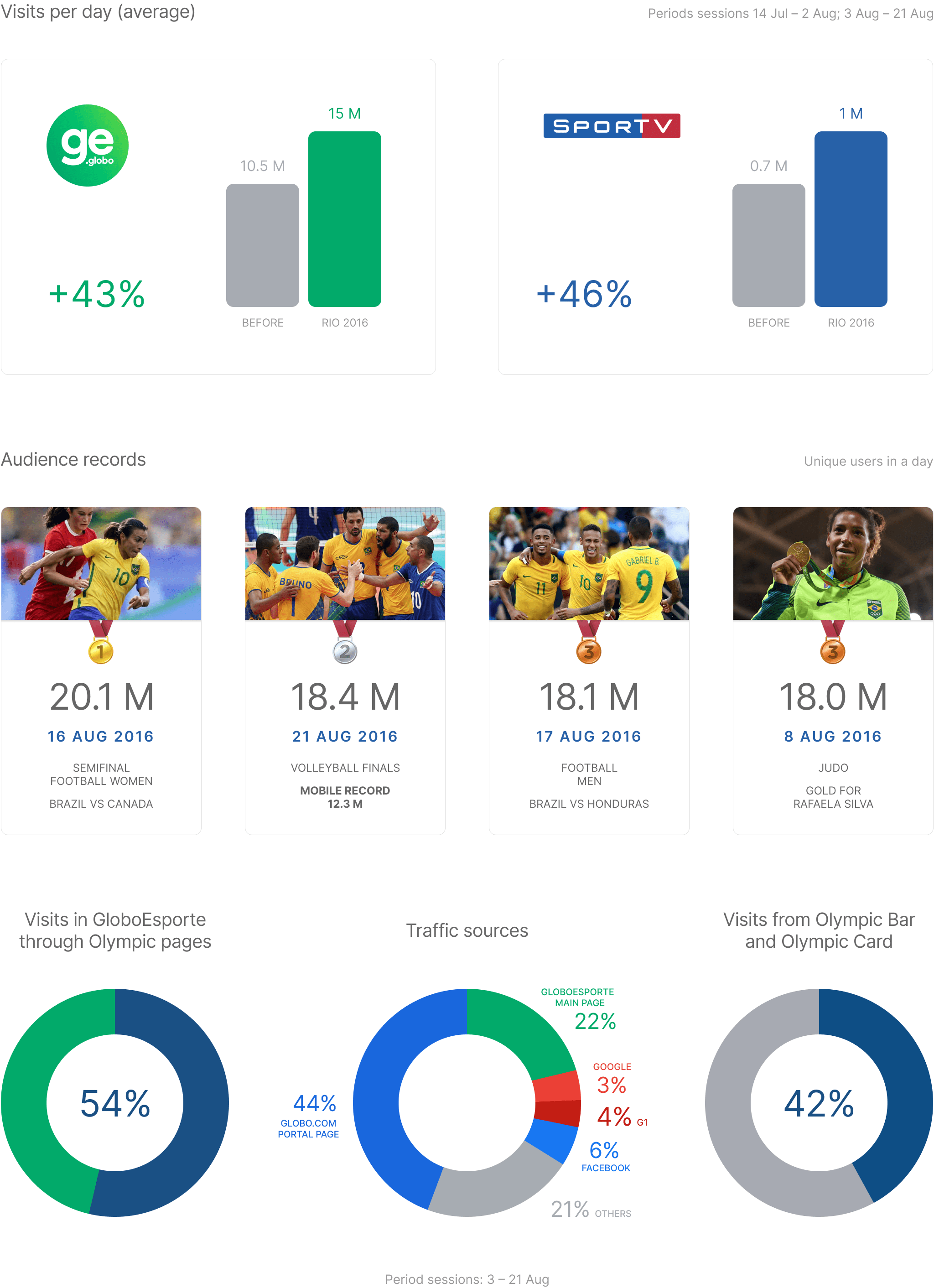 GloboEsporte reached 4 audience records, beating the former one, from the 2014 FIFA World Cup. A major part of that audience was in the live streams. 54% of the visits in GloboEsporte passed through some Olympic page. The Olympic Bar and the Olympic Card, applied in different Globo products, were responsible for 42% of the visits to the Olympic main page. Globo.com’s portal page was the main traffic source of GloboEsporte's Olympic content, and the major part of this traffic was through the Olympic Card.